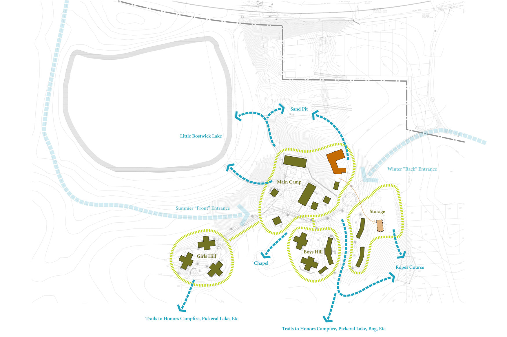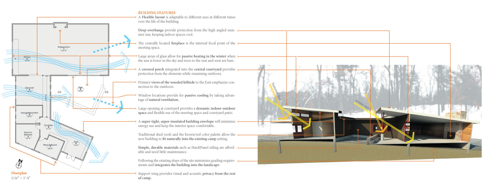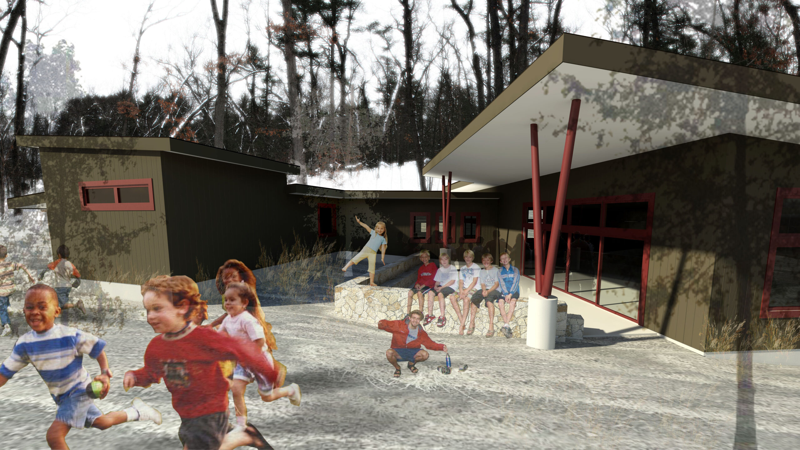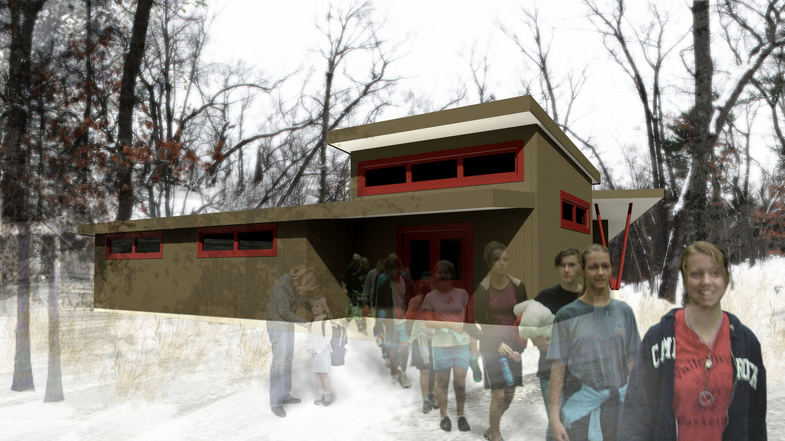 Stated goals for the new nature center building were to serve as a model of sustainability, respect for the environment, and as a tool in educating the campers. This project was taken through the schematic design phase for a camp in rural west Michigan. The program for the building included housing a series of classrooms and a large meeting space connected to a central courtyard to show the campers, staff, and community that a built environment can interact positively with the natural ecosystem.