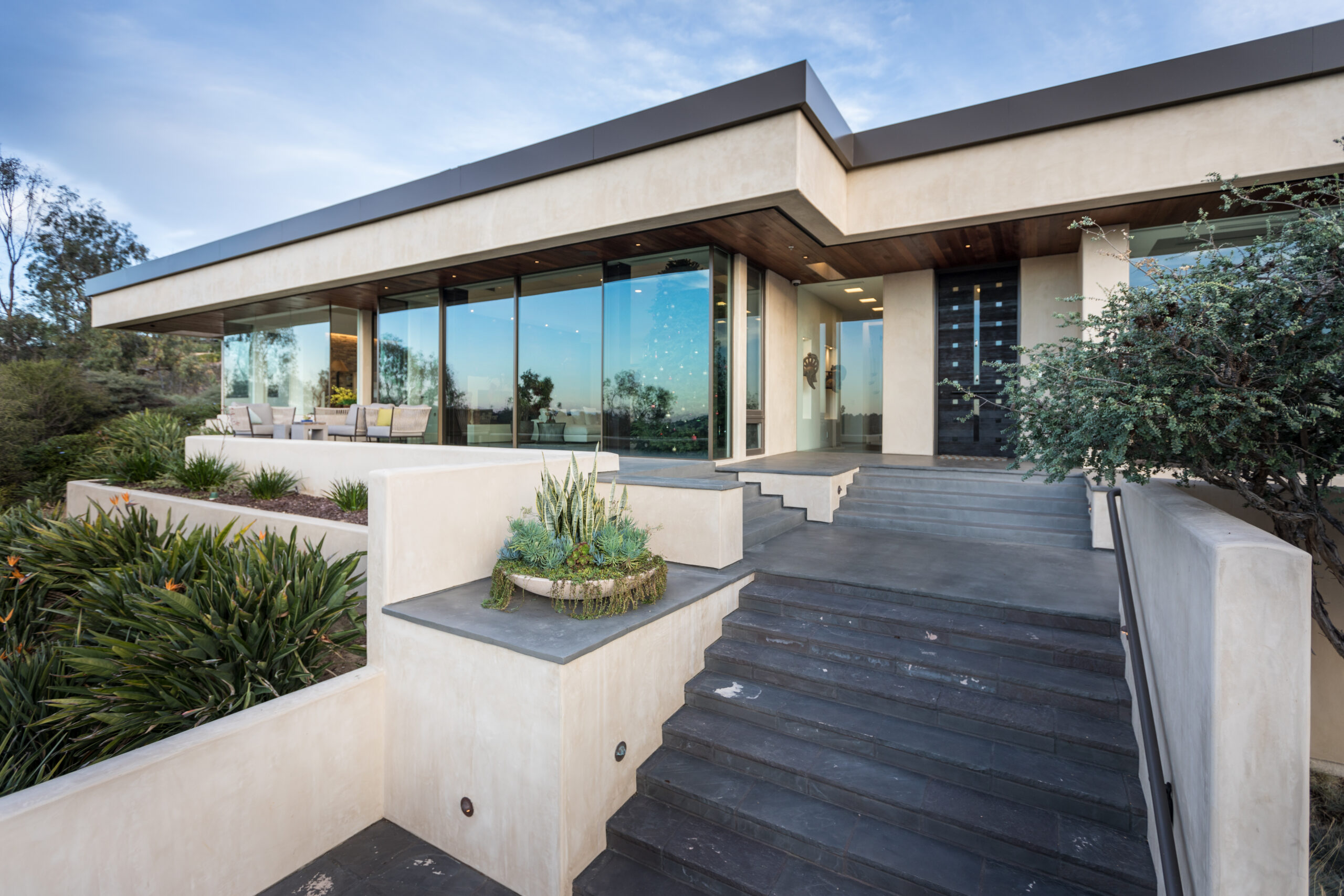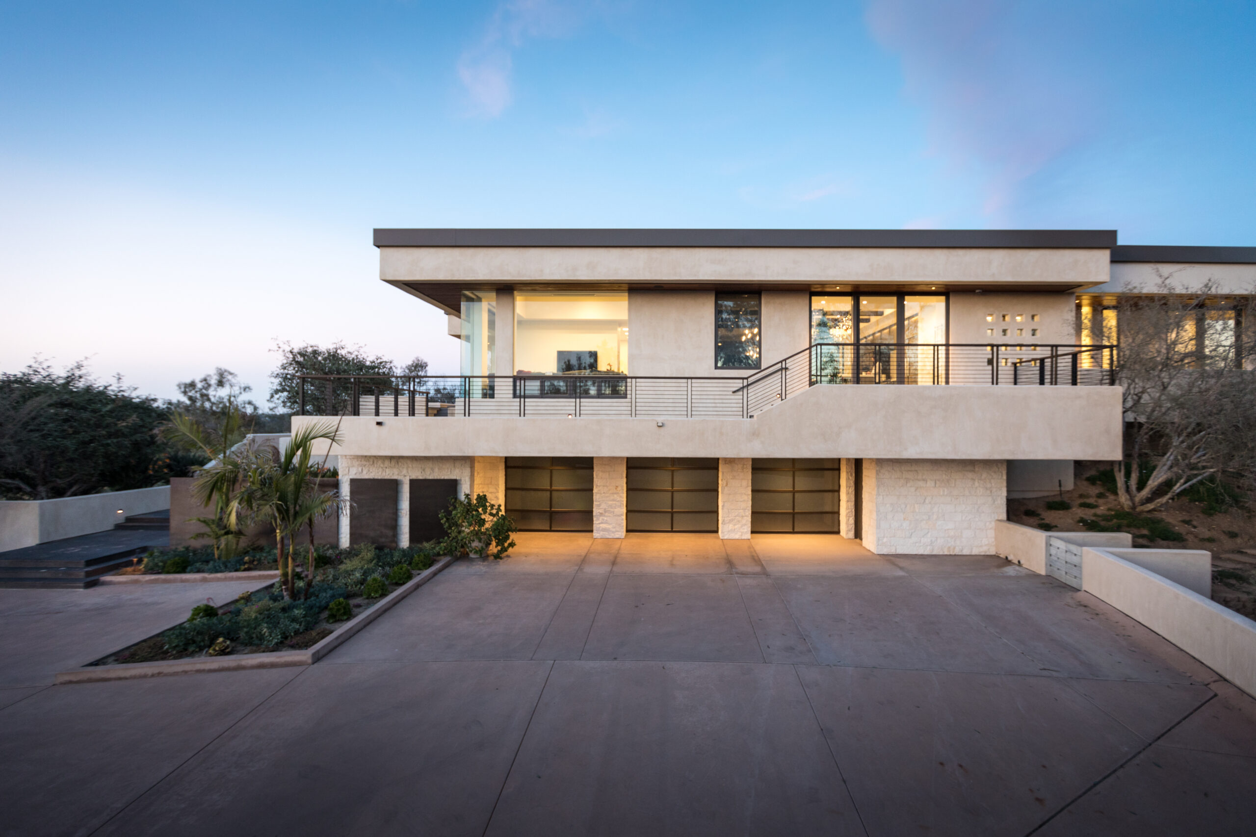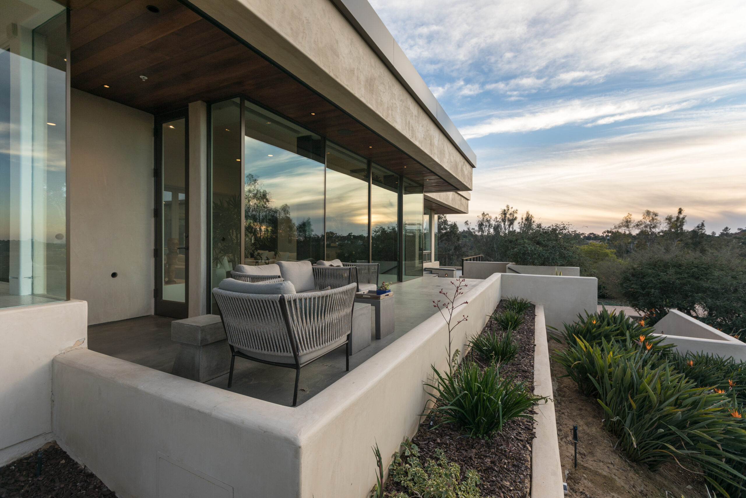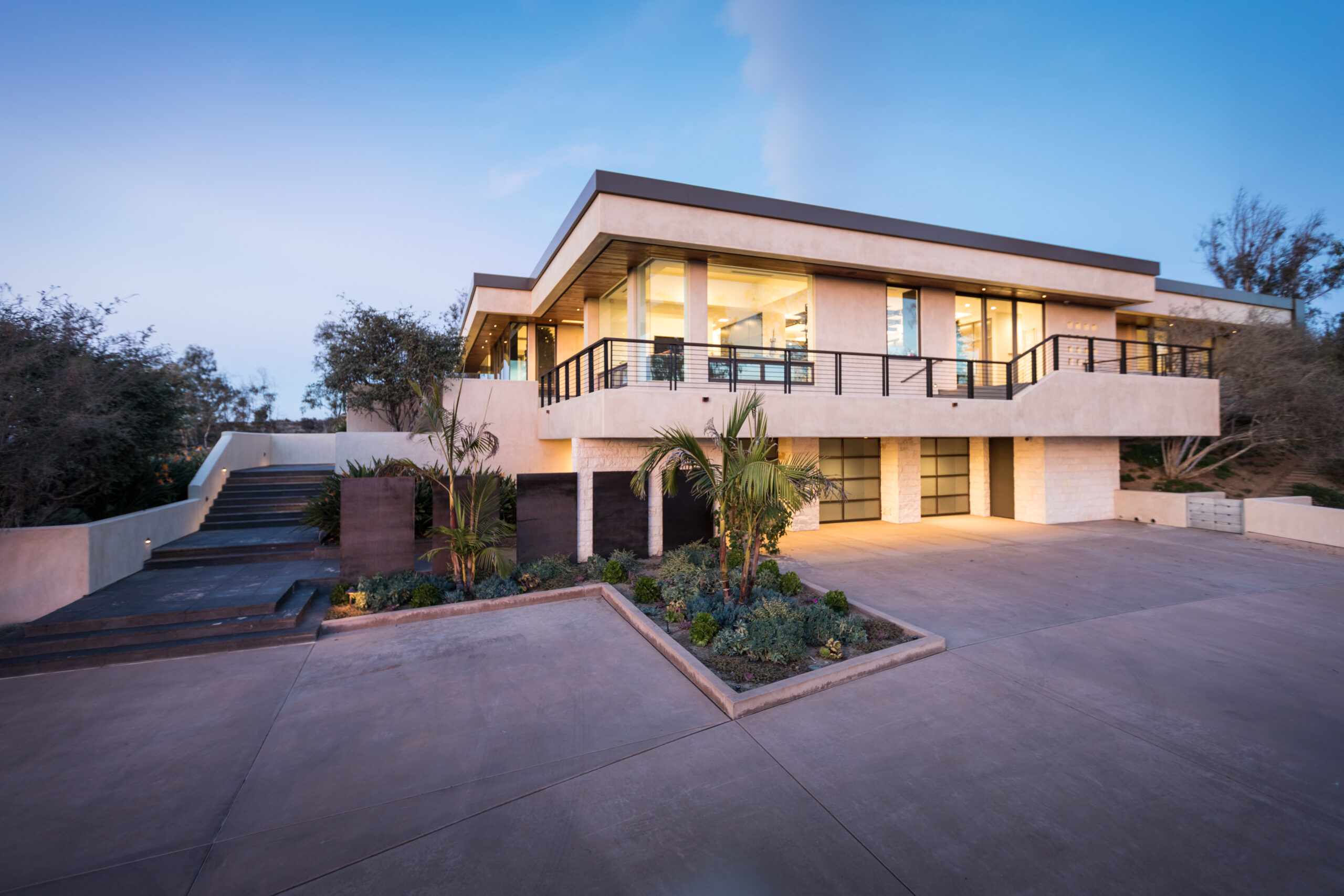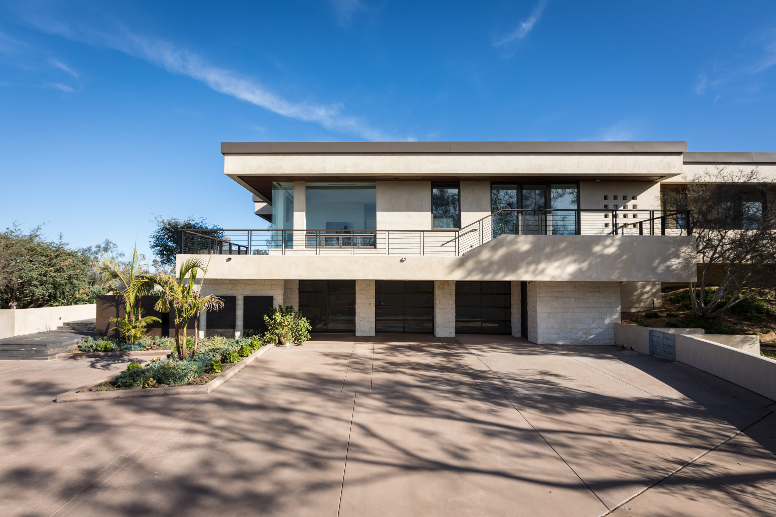 Major face lift of this one-of-a-kind custom home.  Originally built in 1997, the overall structure of the home allowed for design features that would not otherwise be approved under strict Rancho Santa Fe design guidelines.  Exterior materials include stucco and glass walls, a new aluminum fascia and wood T&G soffits.  The new railings are defined by horizontal steel rods and a wood cap.  The rear courtyard was also renovated with a completely refinished pool, new hardscape and a custom cast-in-place concrete fireplace.