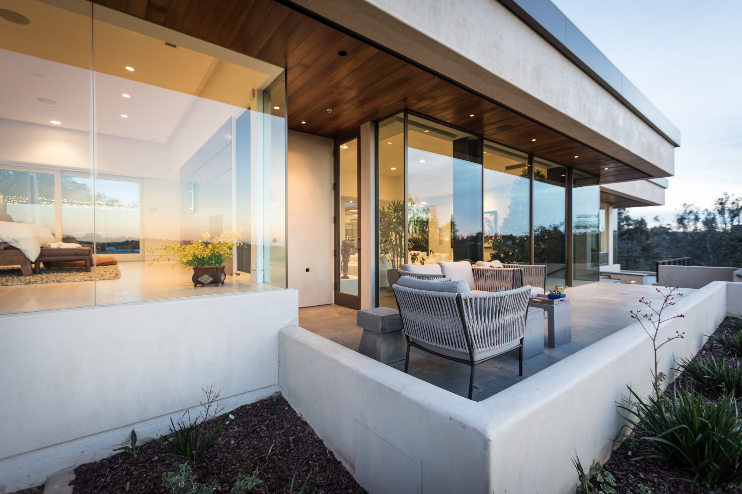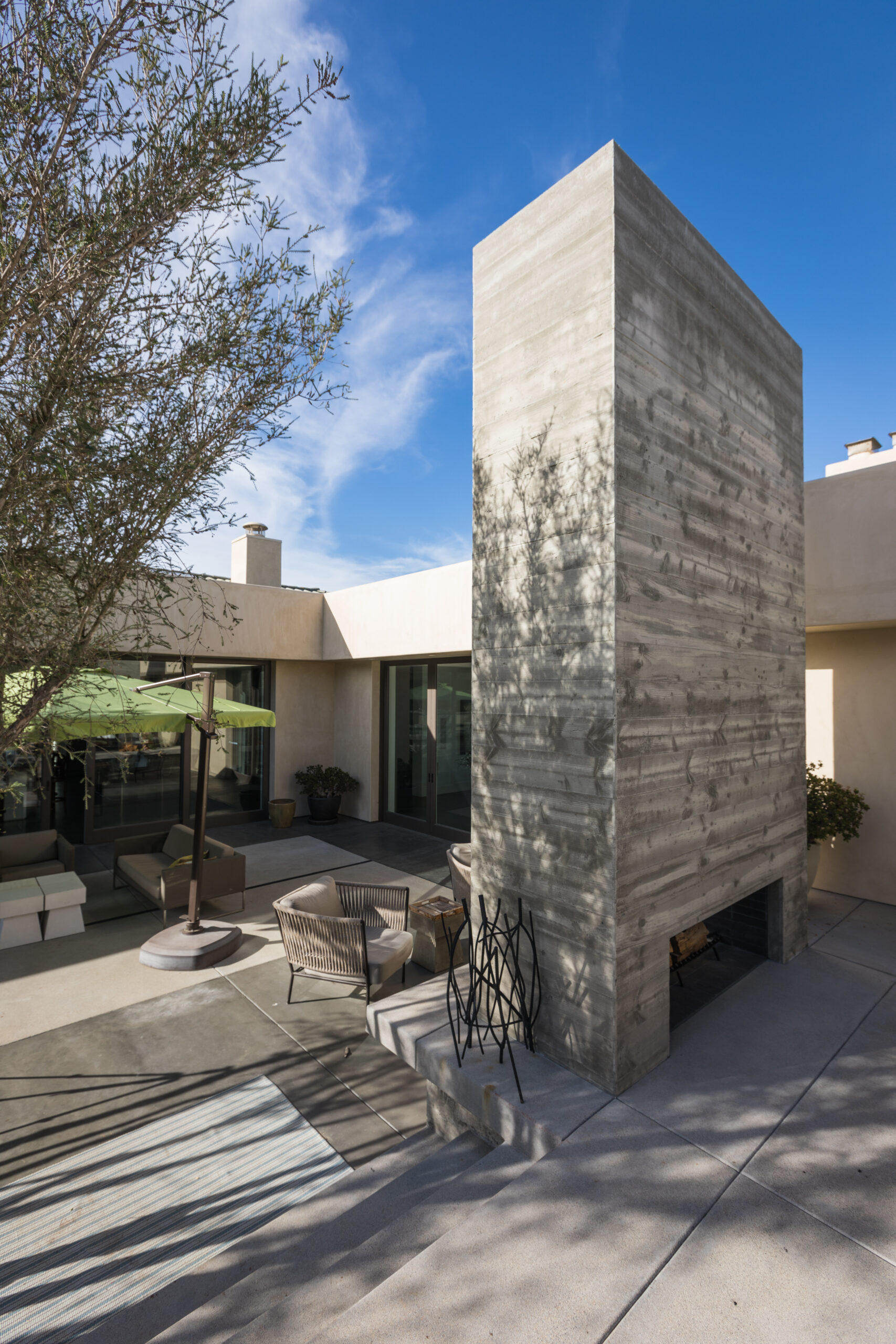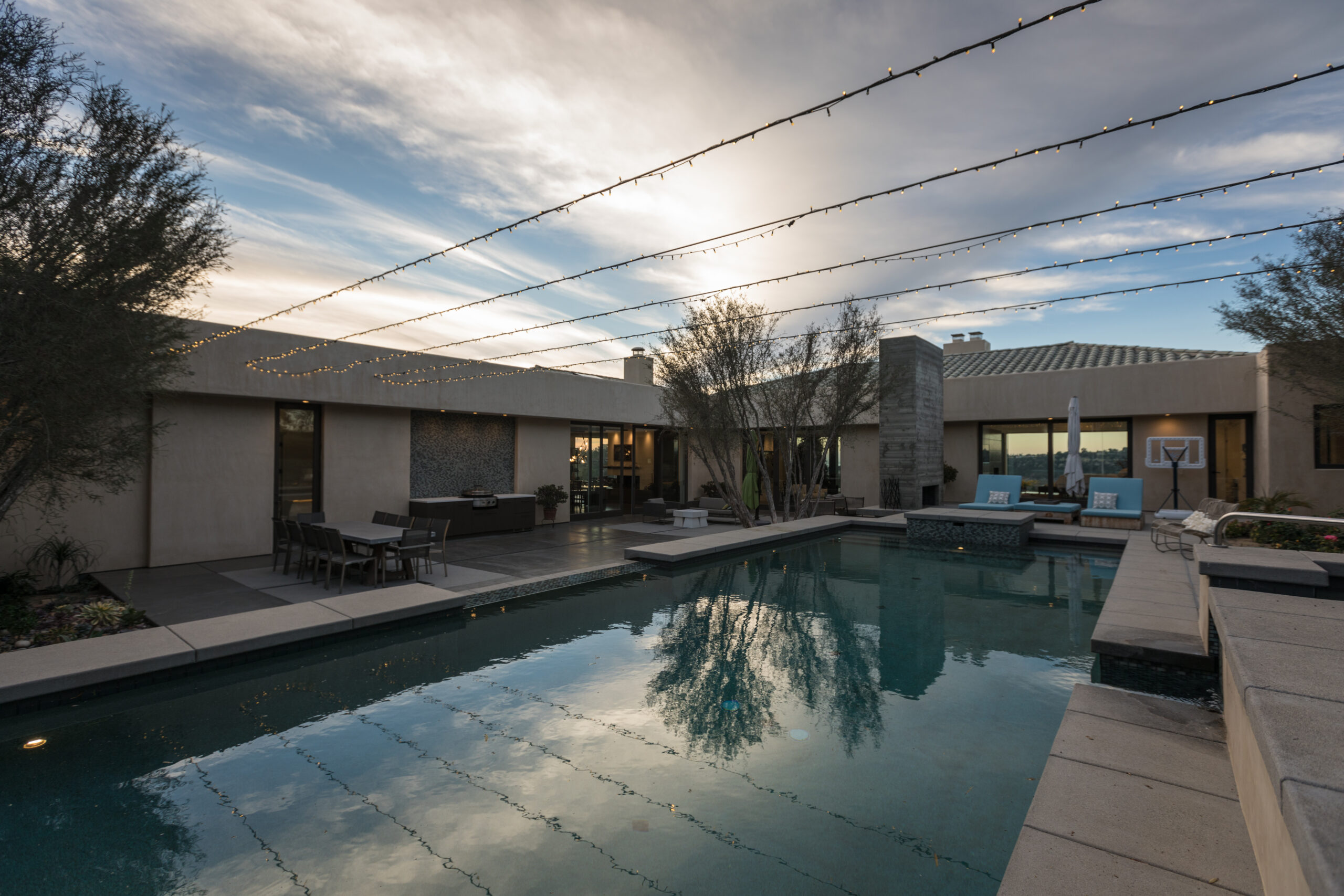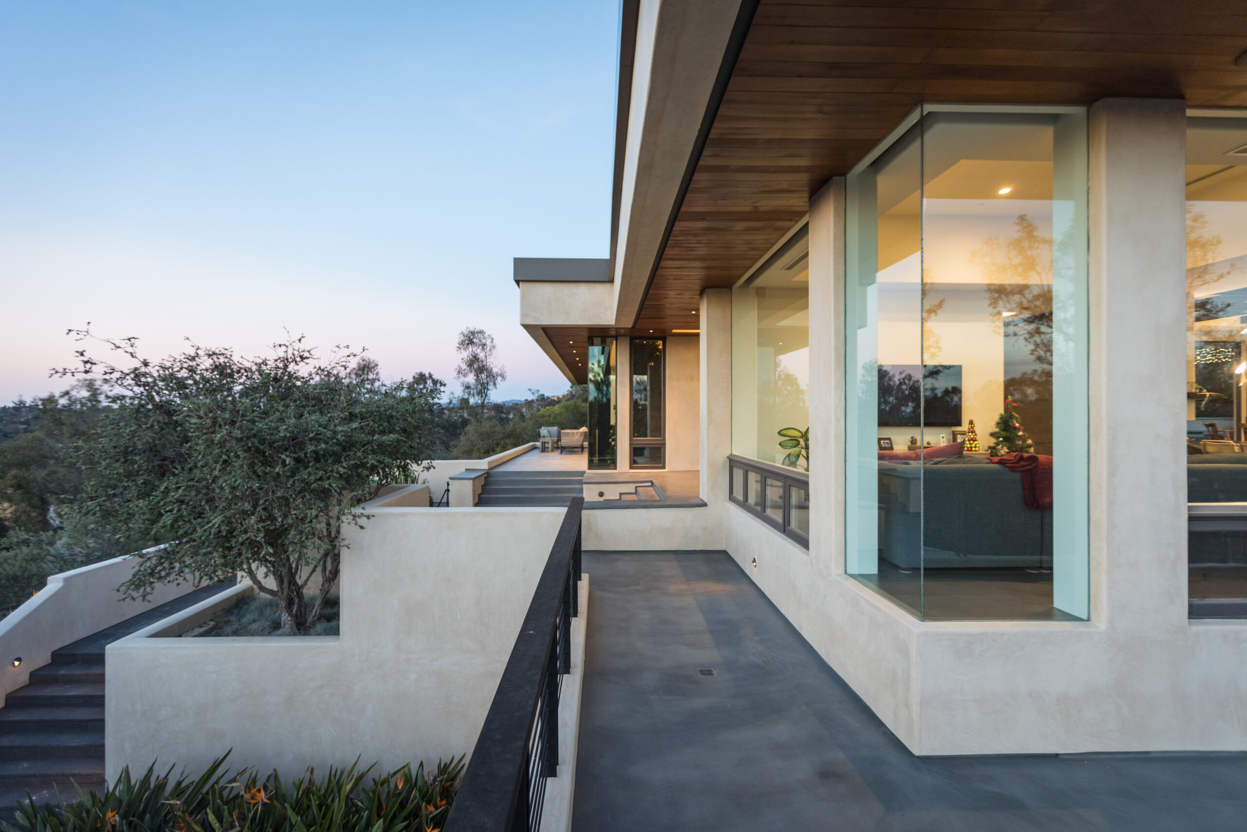 Major face lift of this one-of-a-kind custom home.  Originally built in 1997, the overall structure of the home allowed for design features that would not otherwise be approved under strict Rancho Santa Fe design guidelines.  Exterior materials include stucco and glass walls, a new aluminum fascia and wood T&G soffits.  The new railings are defined by horizontal steel rods and a wood cap.  The rear courtyard was also renovated with a completely refinished pool, new hardscape and a custom cast-in-place concrete fireplace.